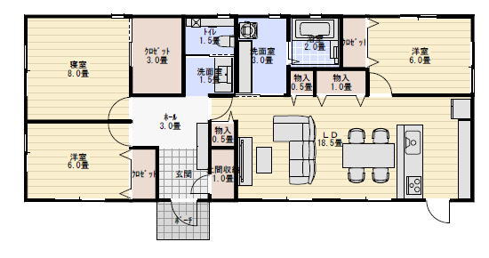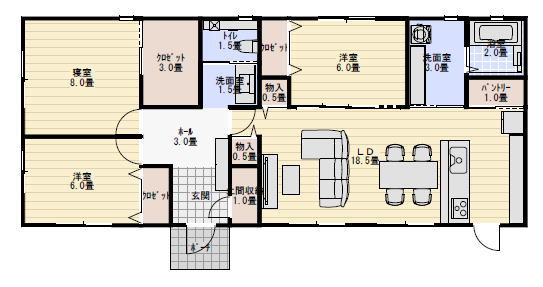 3LDK ですので夫婦二人と子供2人ぐらいを想定して作っています。