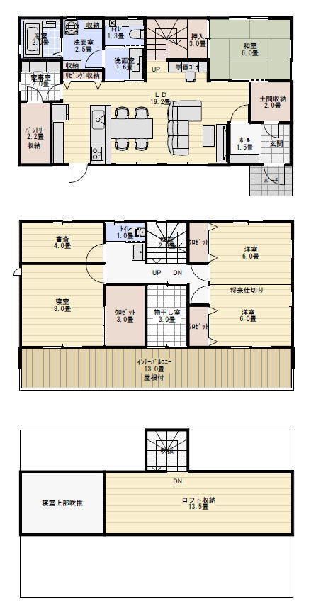 寝室8畳ウォークインクロゼットが3畳、子供部屋にクローゼットが付いています。